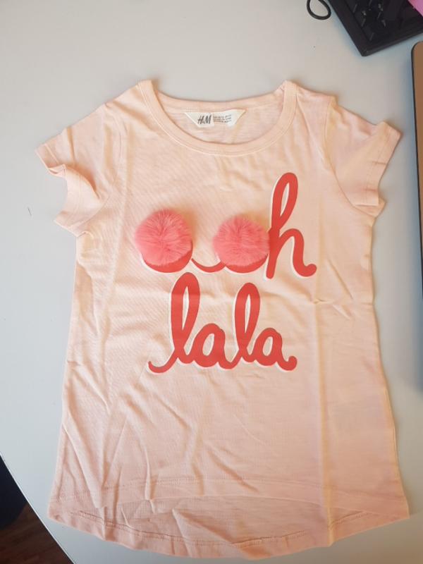 Футболка с декором в виде помпончиков. Низ спинки слегка удлинен. Размеры: 4-6 лет, 110/116см; 6-8 лет 122-128 см; 8-10 лет, 134/140см