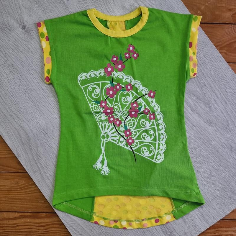 Летняя стильная туника-футболка для девочки из качественного легкого трикотажного полотна. Сзади модель удлененная с вставкой из набивного полотна. Оформлена нежным цветочным принтом. Цвет: Зеленый; Полотно: Стрейч-кулир; Состав: 95% хлопок, 5% эластан; Оформление: Прямая трансферная печать (накат); В наличии рост 104, 110.