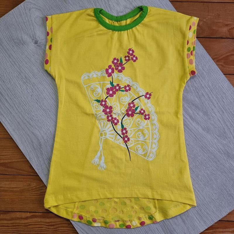 Річна стильна туніка-футболка для дівчинки з якісного легкого трикотажного полотна. Ззаду модель удлененная з вставкою з набивного полотна. Оформлена ніжним квітковим принтом. Колір: Жовтий; Полотно: Стрейч-кулір; Склад: 95% бавовна, 5% еластан; Оформлення: Пряма трансферна друк (накат); В наявності ріст 116