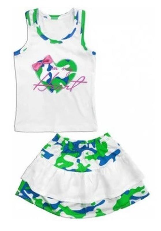 Летний костюм для девочки, состоит из двух предметов. Спортивная майка-борцовка из натурального полотна. Красивая юбка с двумя оборками. Цвет: Белый; Полотно: Кулир; Состав: 100% хлопок; Оформление: Вышивка; В наличии рост 104, 110, 116, 122.