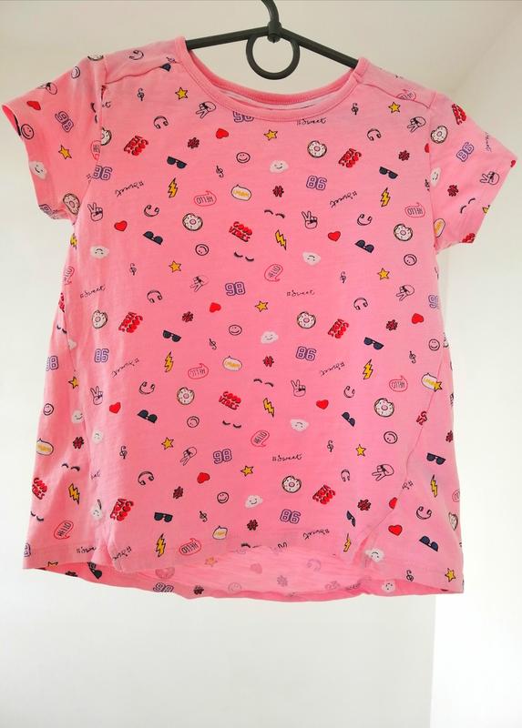 Футболка для девочки нежного розового цвета с ярким принтом в виде маленьких надписей и рисунков. Оригинальный крой, приятный натуральный трикотаж. На возраст 7-8 лет.