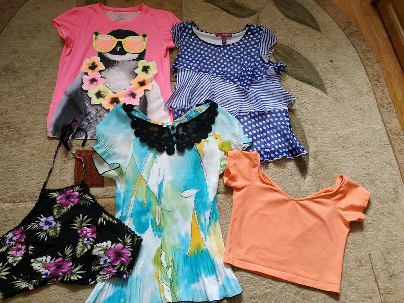 Футболки по 55,синя в горошок продана Топіки по 40,топік чорний проданий.