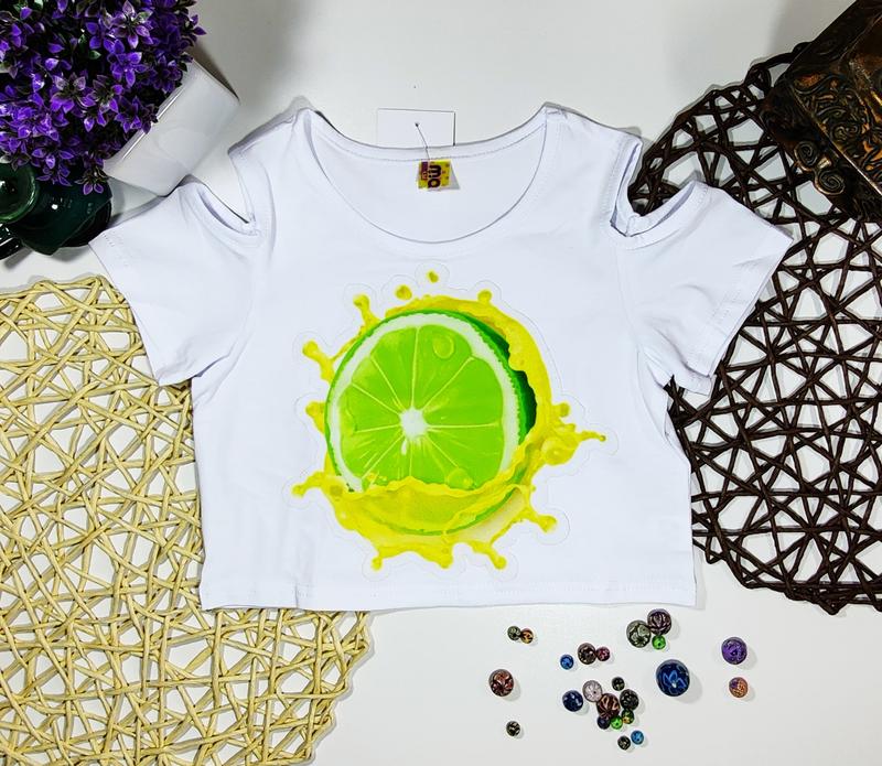 новинка 2020!!! невероятно красивый топ с оголенными плечиками яркой и сочной наклейкой ткань турецкий трикотаж РЕКОМЕНДУЮ!!! размер/длина/пог 164/38/40-1шт --------------------------------------------- +-1см