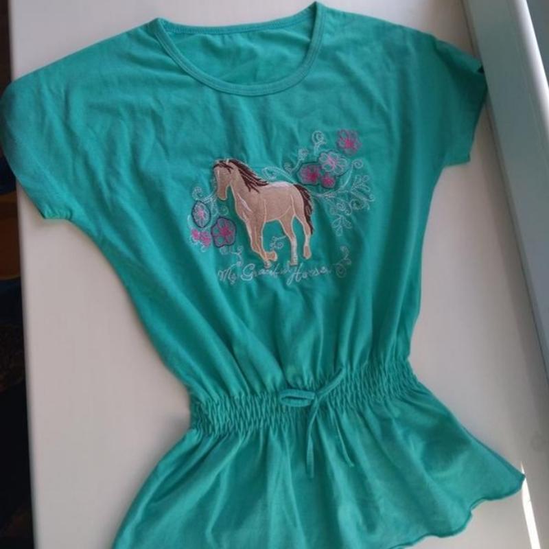 Туничка с коротким рукавом, в поясе простроченная резинка. Бантик декоративный. Ярлыков с размером нет. Замеры(плюс/минус, на ровной поверхности): Длина 54 см Ширина под мышками 40 см Длина рукава от горловины 20 см Состояние отличное. Дыр, пятен нет. Есть вопросы? Напишите мне!)