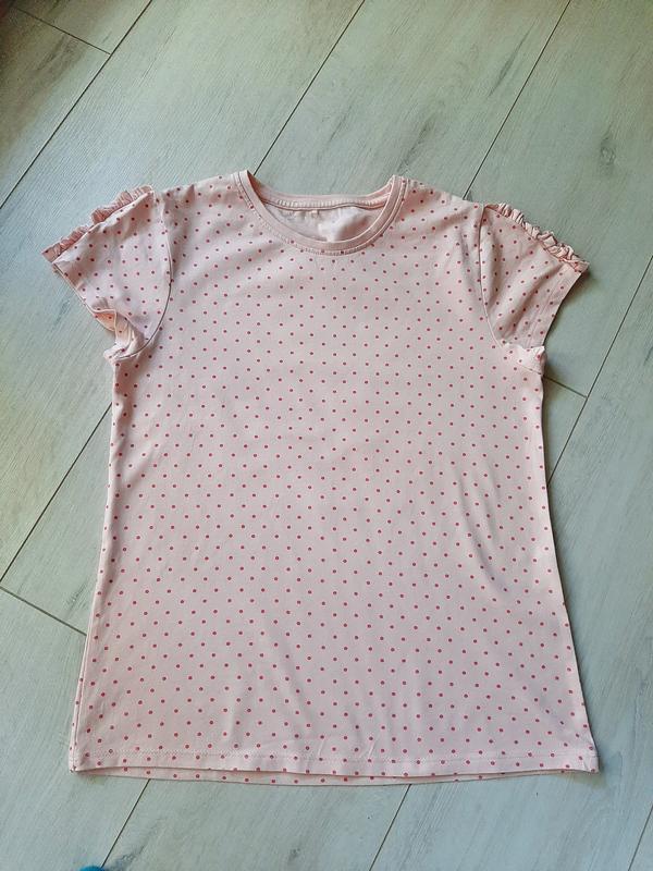 Футболка для девочки в нежно розовом цвете. Круглый вырез горловины. Рюшики на рукавах. Состояние идеальное. Размер на 11-12 лет.