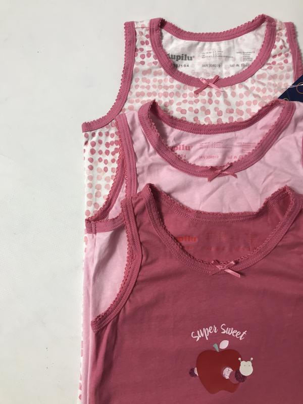 Комплект маек на девочку Lupilu - Германия Спецификация: Тип белья: майка Материал: хлопок Состав: 100% хлопок Размер: 98/104 - 2-4 года Замеры:длина 46.,пог 26,5.,низ 27,5 см 110/116 - 4-6 лет Замеры:длина 47,5.,пог 30.,низ 31 см Цена за набор 330грн
