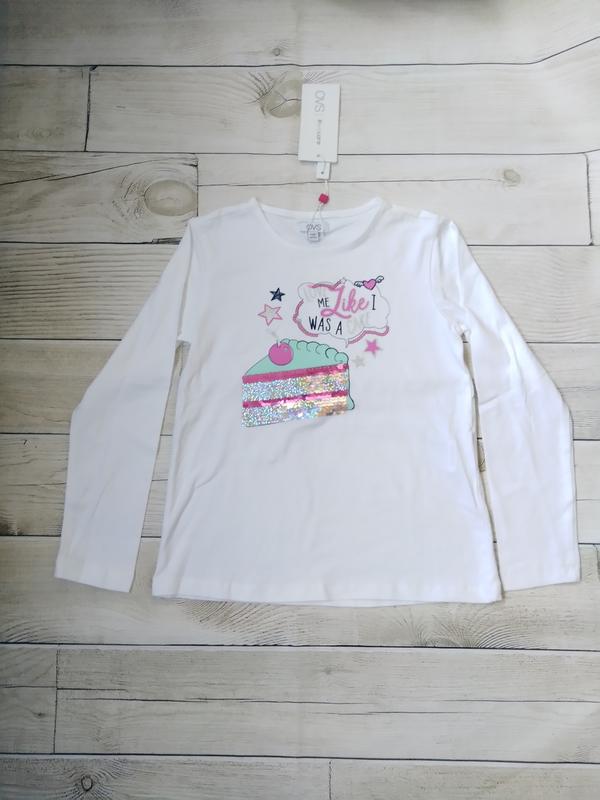 OVS Возраст 7-8 Рост 128 см Длина 46 см Ширина в груди 32см рукав от горловины 50 см Ткань: 95% хлопок украса пайетки, принт.