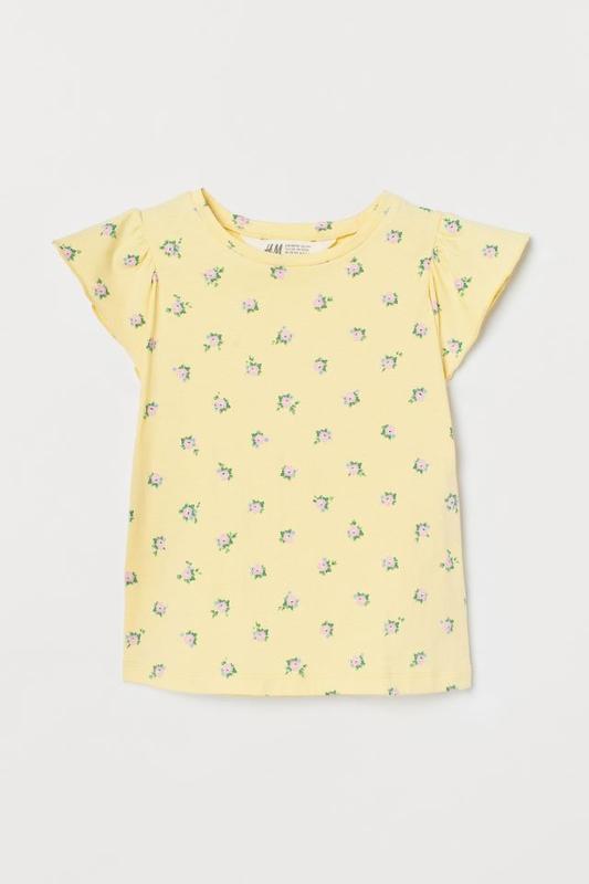 Милые футболочка с цветочным принтом H&M Отличное качество по отличной цене! Топ из мягкого хлопкового трикотажа с набивным рисунком. Круглый вырез горловины и короткие рукава-крылышки с обработанным оверлоком срезом. Состав: Хлопок 100%. Цвет: светло-желтый/цветы. Размеры в наличии: 122/128, 134/140. Цена окончательная!