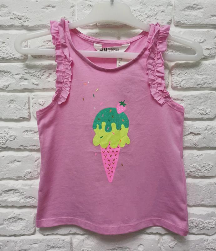Майка H&M c принтом мороженое с блестками. Размеры: 98/104: длина 40см, ширина 29см. 110/116: длина 44см, ширина 29,5см. 122/128: длина 48см, ширина 31,5см. Состав ткани: 100%котон. Страна-производитель: Бангладеш