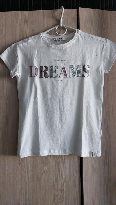 Белая детская футболка с вышитым принтом от garcia jeans. Размер 140-146 ПОГ - 38,5см Длинна - 53см