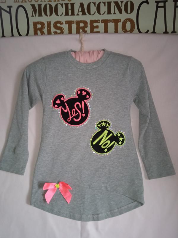 Эффектная туника для маленькой модницы.. Разновеликий подол,прикольные мордочки миккимаусов украшены пайетками. Турция Длина по переду 40 Длина по спинке 54 Длина рукава от плеча 40 ПОГ 31 Пот 30 ПОБ 35