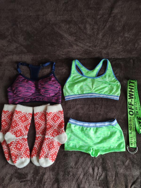 Продам шерстяные носки 2 пары, спортивный топик и костюм маечка и шортики, пояс салатовый. Замеры по запросу. Все вещи в новом состоянии.