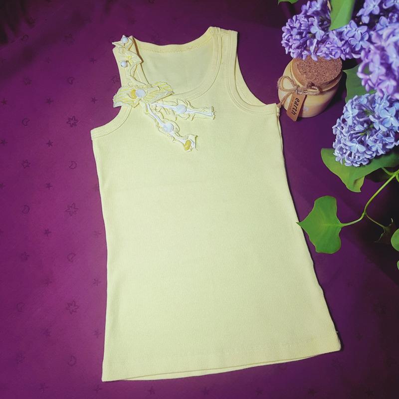 Новая. Красивый, жёлтый цвет, не яркий. Ткань рубчик, тянется. Замеры: длина 50см, грудь 28см