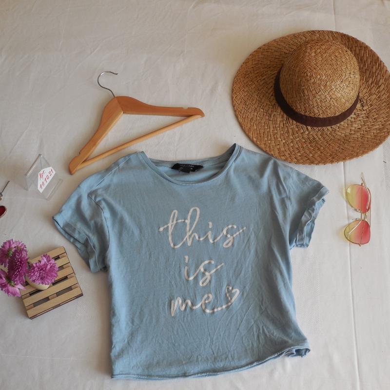 в отличном состоянии 🌱 хлопок голубой топ фирма newlook 12-13 лет с принтом - this is me- под руками 44 длина спинки 44