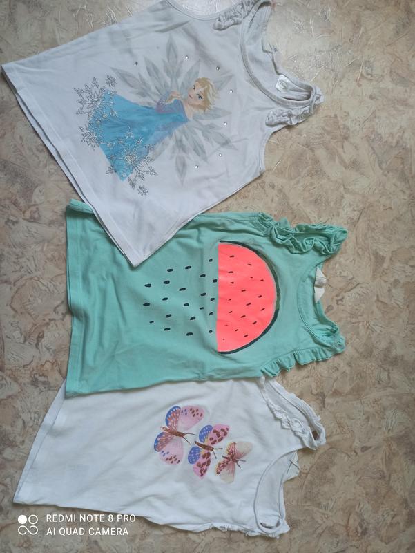 Майки в очень хорошем состоянии, на Эльзе есть следы от маленьких пятен у картины показала, не видно особенно.И на майке возле бабочки светлые две точки.Размер один и тот же