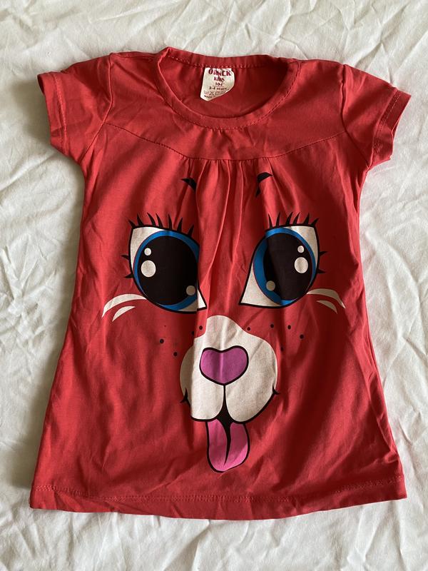 Фото на тілі нема Зпереду малюнок Тягуча Плотность середня Рукави короткі Фасон вільний подовжений(туніка) Воротник круглий знизу невеликі складки Підійде на 2-4 роки оріентуйтесь по замірам Із нюансів-плями і трохи під рукавом (не критично) Нюанси у ціні враховано Довжина 42,5 см) Плечі 21,5 см) Рукав 7 см) Пог 25,5 см) Пот 27 см) Знизу 33,4 см)