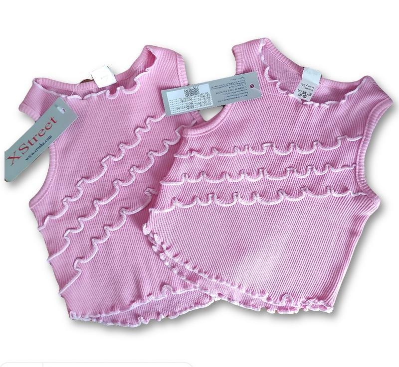 майка з рюшами ,100% бавовна , розмір 98-56, колір рожевий. приємна тканина , в ідеальному стані . чудовий варіант для дівчинки на літо . зроблено в Україні.