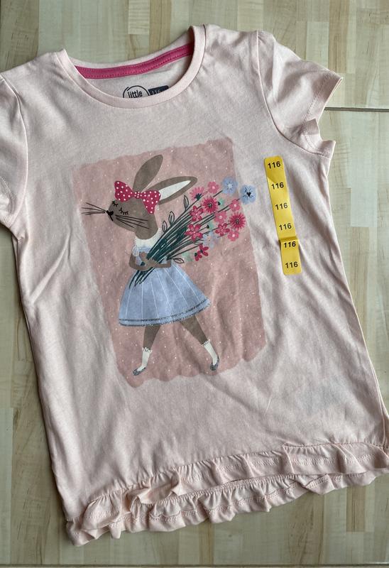 Футболочка на дівчинку у блідо-рожевому нюд відтінку з принцом у розмірі 116 (5-6 років ) з рюшею по низу . Замір : Плечі (від шва до шва ) -25,5 см Плече -5,5 см Рукав -10см Довжина від плеча -44 см з рюшею (без 42 см) Ширина рюши 2-2,5 см Довжина спереду по центру -38 см з рюшею Довжина по спинці -46 см з рюшею ПОГ -32 см Ширина по низу 33 см