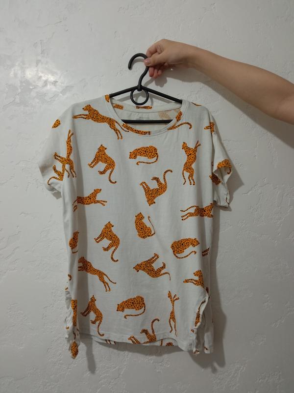 стан ідеальний, носили дуже мало. дефектів жодних немає, принт в ідеальному стані. по краях футболки розріз заміри: плечі: 40 см довжина виробу від плечового шва: 53 см