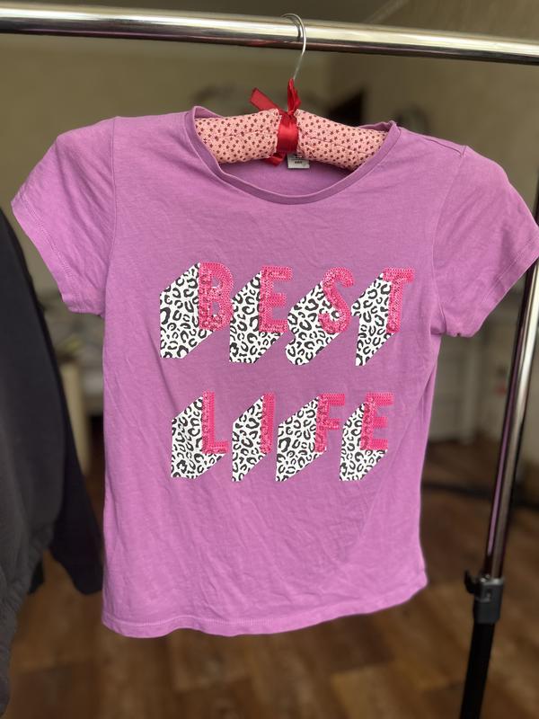 Дуже гарна футболка фіолетового кольору, колір як на фото. Без дефектів. Весь візерунок цілий.
