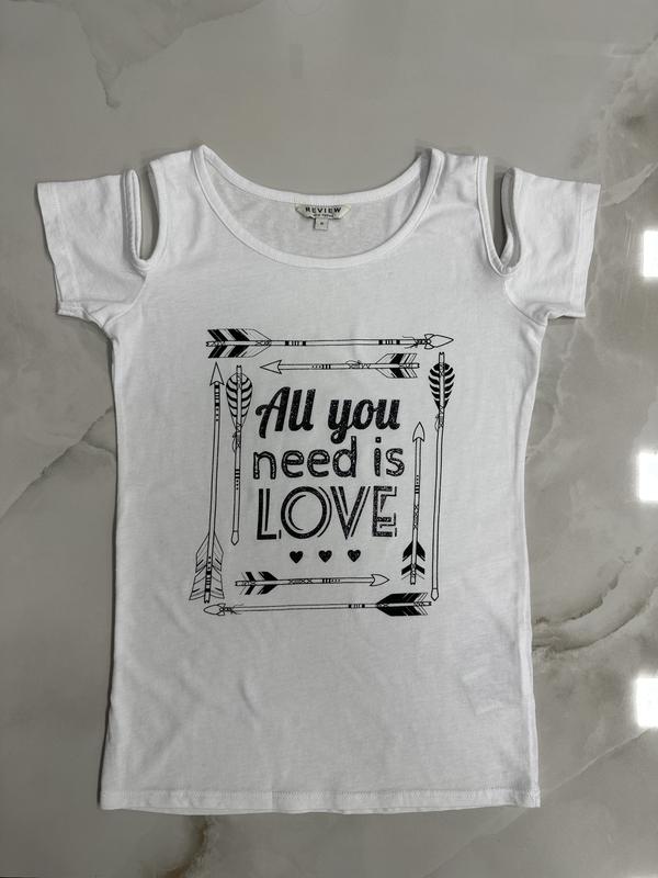 Красивая футболочка с открытыми плечами, состояние идеальное, размер 152-158. Замеры: длина 55см, пог 39см.