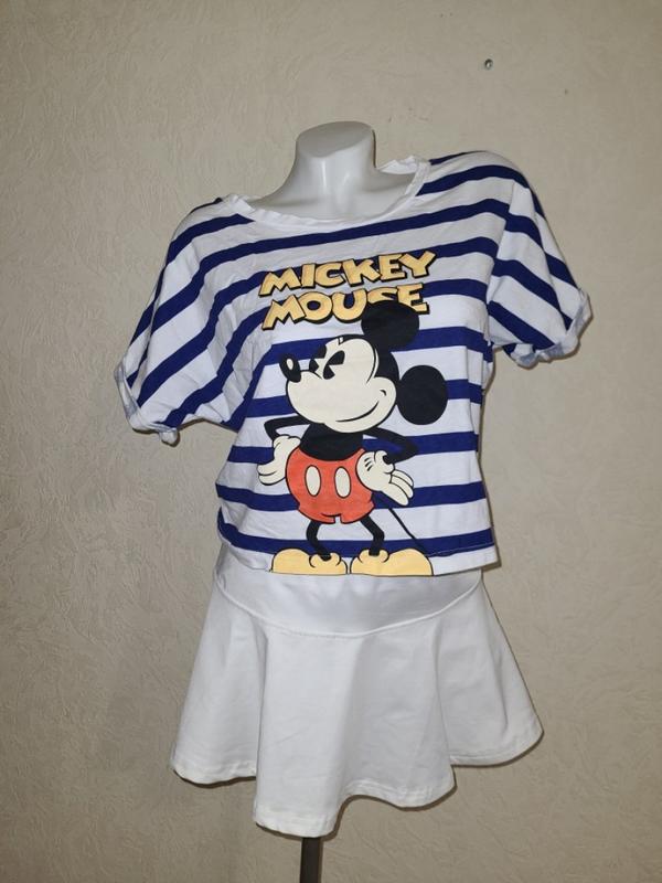 Футболочка біло-синього кольору у смужку, з наліпкою міккі мауса. Виміри за бажанням.