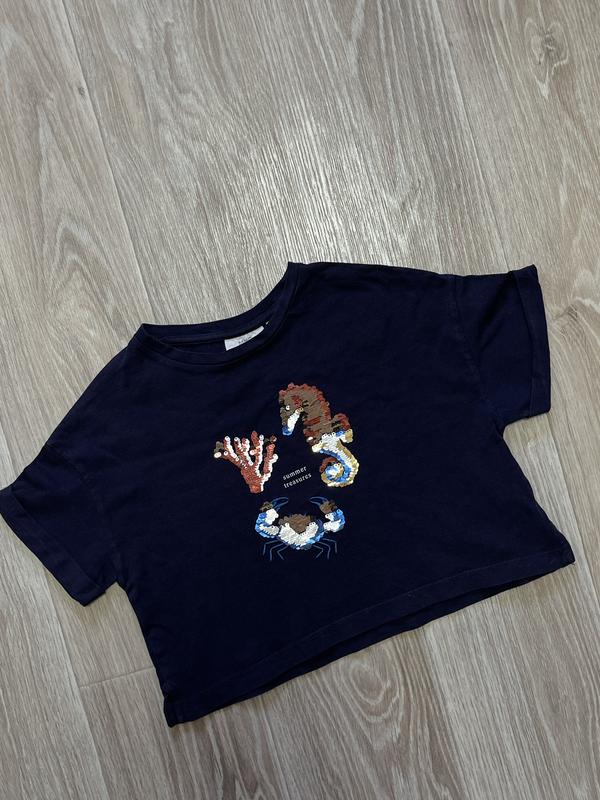 ФУТБОЛКА с пайетками Цвет темно-синий Состояние отличное 🏷️Mango 7 лет/122 Длина 39. ПОГ 39