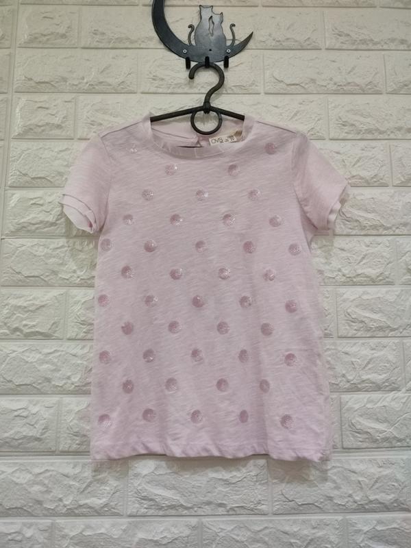 Очень красивая, нарядная футболочка, рисунок пайетки, украшенные рукава и горловина шифоном. Нежного розового цвета Размер 134