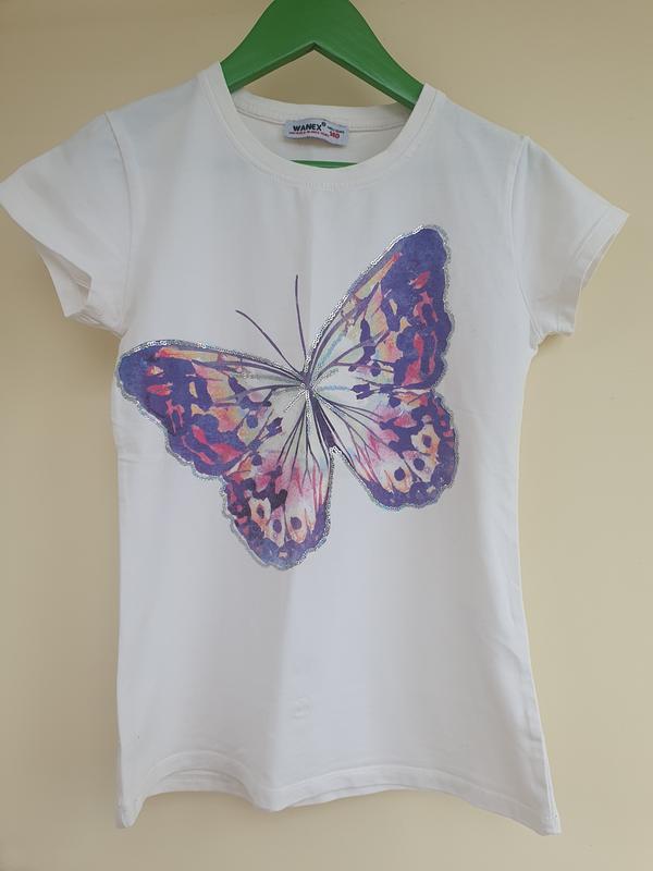 Футболка, пайетки по контуру крыльев бабочки.