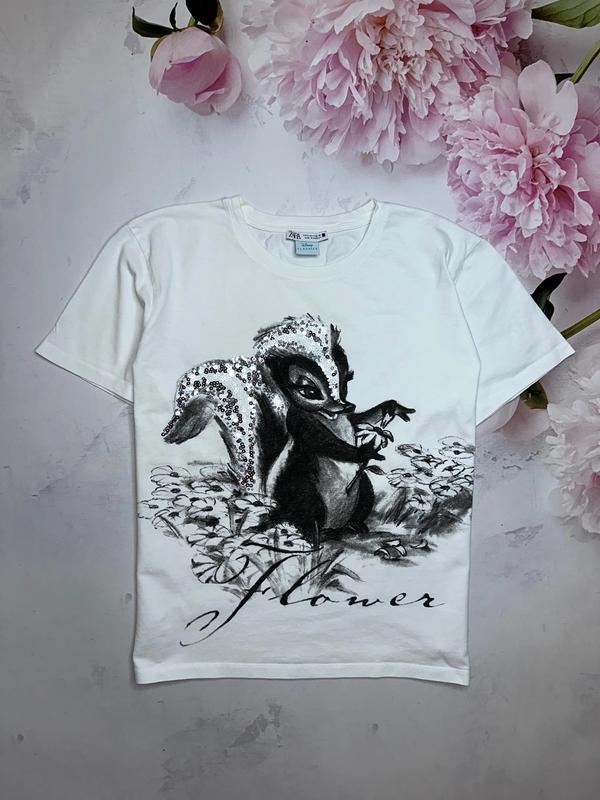Белая футболочка со скунсом Disney Украшено пайетками Состояние идеальное 🏷️Zara Размер S- можно дольше Длина 59. ПОГ 52.