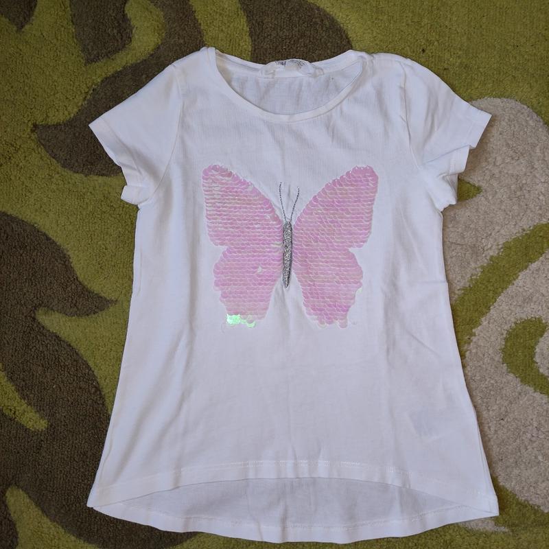 Футболка H&M з метеликом луска можна перевертати на інший колір.вона як туніка, поринена футболка.розмір 6-8 років.солодіння гарне, є тільки жовта точка приблизно 1 мм на спині (видно біля лейби).довжина від плеча та горловини спереду 45 см, по спині довша.в грудей 32.бавовна. Дивіться інші свої оголошення.