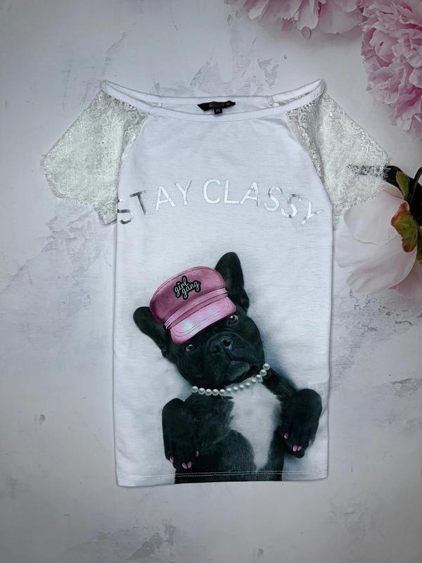 Футболочка с милым бульдогом Рукавчики из гипюра Состояние новой 🏷️CoolCat 11-12 лет/146-152 Длина 54. ПОГ 36