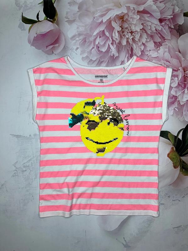 Яркая футболочка с лимончиком из пайеток Состояние идеальное без дефектов 🏷Orchestra 🔹8 лет Длина 46. ПОГ 35 🔹10 лет/140 Длина 46. ПОГ 36