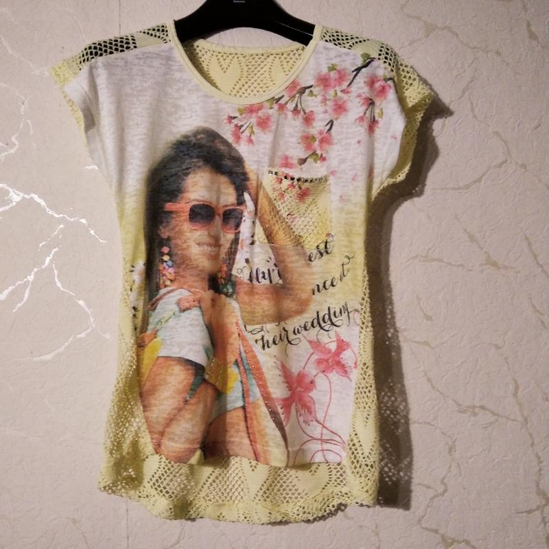 Футболка с принтом и сеточкой на спинке на девочку ростом 128-140 см. Легкая летняя футболка из натуральной ткани. Спинка удлинена. ДВ ( спинка) 57 см, ДВ 51 см, ПОГ 33 см.