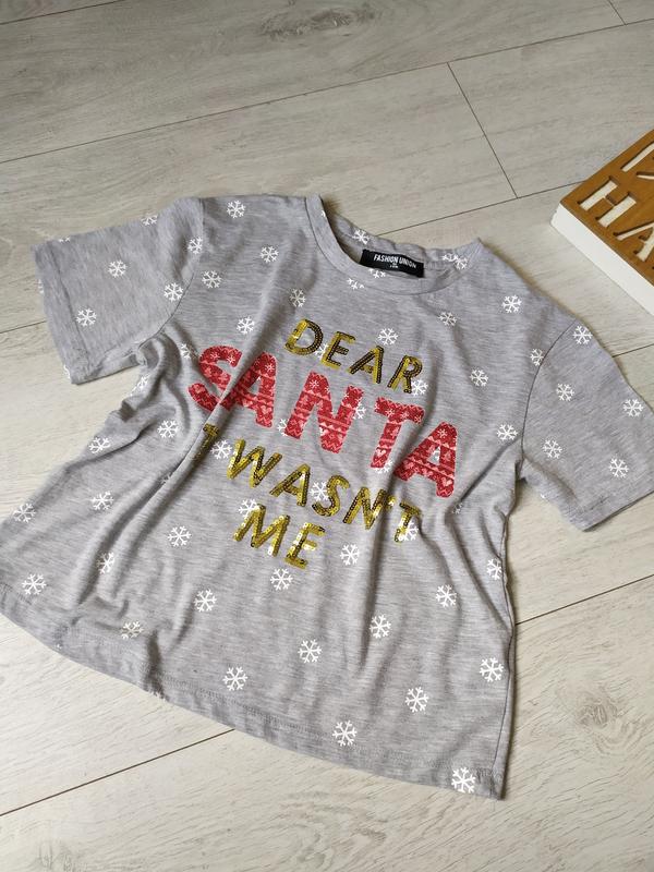 Симпатичная футболка с новогодним принтом, вышитые буквы из пайеток. Подойдет для новогодних и рождественских праздников, создаст настроение на праздник и украсит фотосессию. Возраст 9-10р. Бренд Fashion Union. Стан идеален. (1)