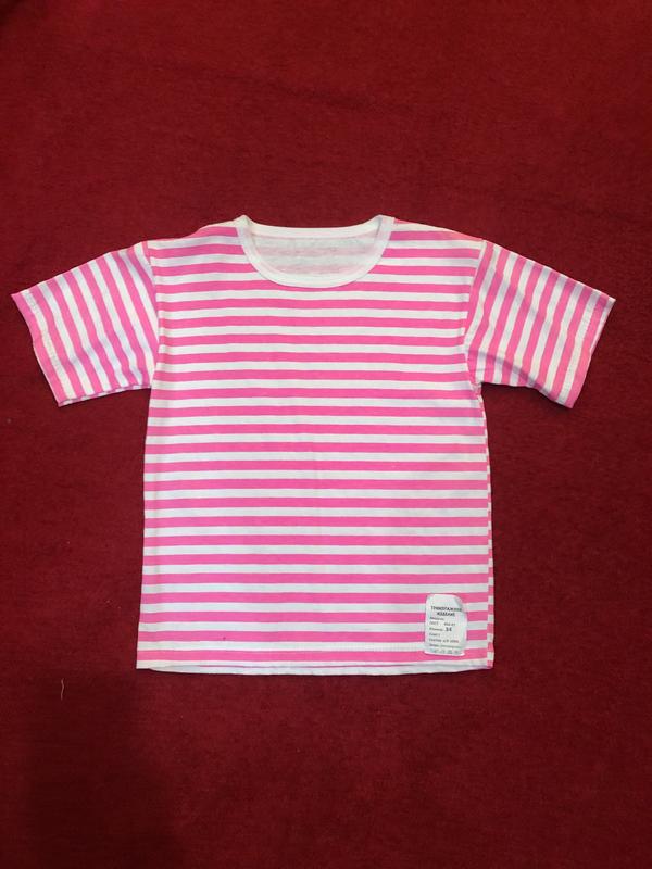 Яскрава футболка на дівчинку В наявності 2 шт різного розміру: на 2/3 роки та на 7/8 років (краще орієнтуйтеся по вказаним замірам) Заміри: довжина 33/ 43 см півобхват по груді 27/ 35 см довжина рукава 8/ 15 см плече 7/ 10 см Тканина: бавовна Колір: малиновий/білий