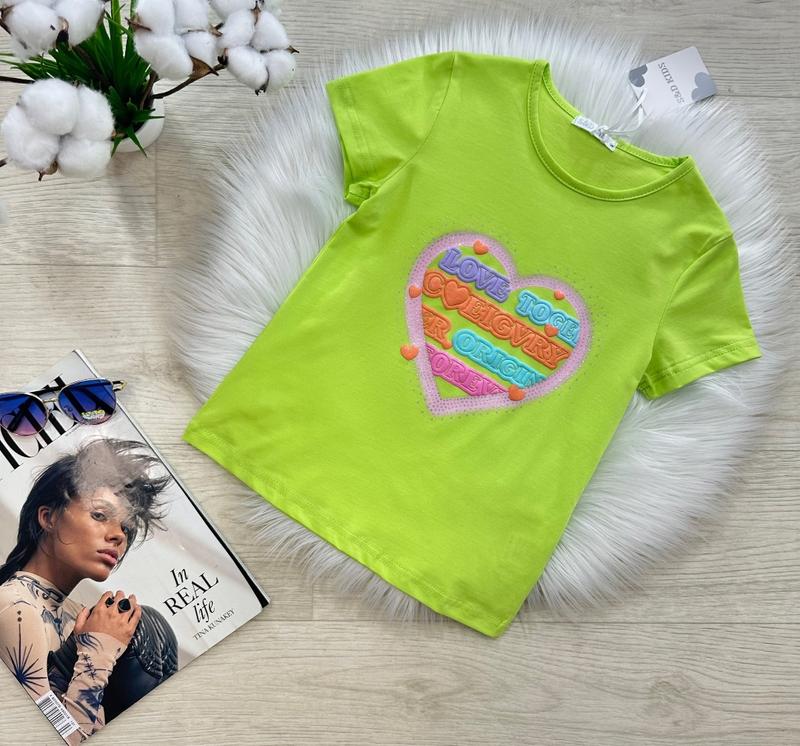 Базовая трикотажная футболочка 😍 с ярким объемным принтом 🩵💜🩷💛 Тканина: трикотаж (95% cotton 5% spandex) Виробник: S&D KIDS 🇪🇺 ЗАМІРИ ⤵ +/- 1-2см!!! ◾98- длина 39см / ПОГ 29см. ◾104- длина 40см / ПОГ 30см. ◾110- длина 42см / ПОГ 31см. ◾116- длина 44см / ПОГ 32см. ◾122- длина 45см / ПОГ 33см. ◾128- длина 47см / ПОГ 34см.