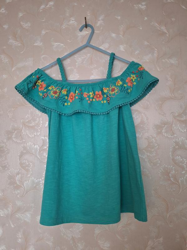 Блуза з воланом яскравого зеленого кольору, на волані аплікація під вишивку, нова, розмір 10-11років (140-146), але вона більшомірна. Заміри: довжина від брителі до низу 56см., довжина по боковому шву 39см., ширина під рукавми 41см., ширина по низу 56см