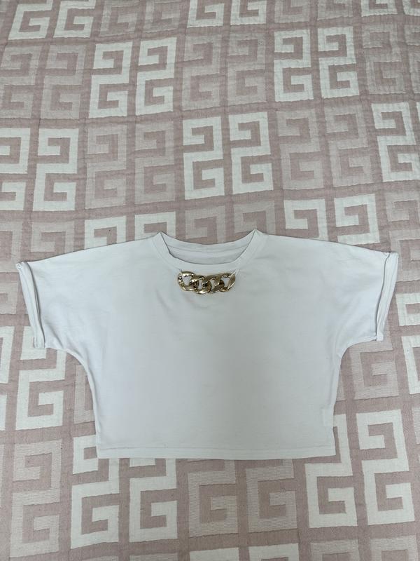 Стильная футболка в идеальном состоянии на девочку 11-12роков! Дефектов нет. Белоснежная. Украшение снимается. Заміри на фото.