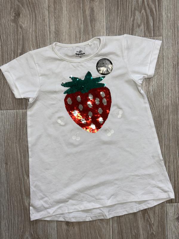 Футболка с клубничкой Пайетки интерактивные 🏷️Topolino 8 лет/128 Длина 50/53. ПОГ 34