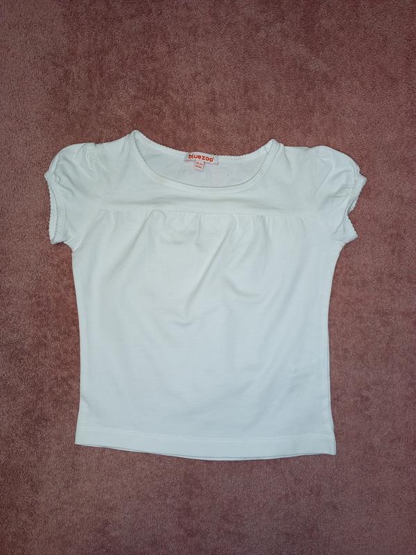 Подписывайтесь на мою страницу. БЕЗПЕЧНА оплата После платья (на карточку) ТОЛЬКО через УКР ПОШТА!!! Футболка blue zoo Возраст 1,5-2 года. Отличное состояние. Белая, незначительная точка на горловине, фото По плечах 25 ПОГ 30 ПОТ 28 Рукав 7 Длина 35