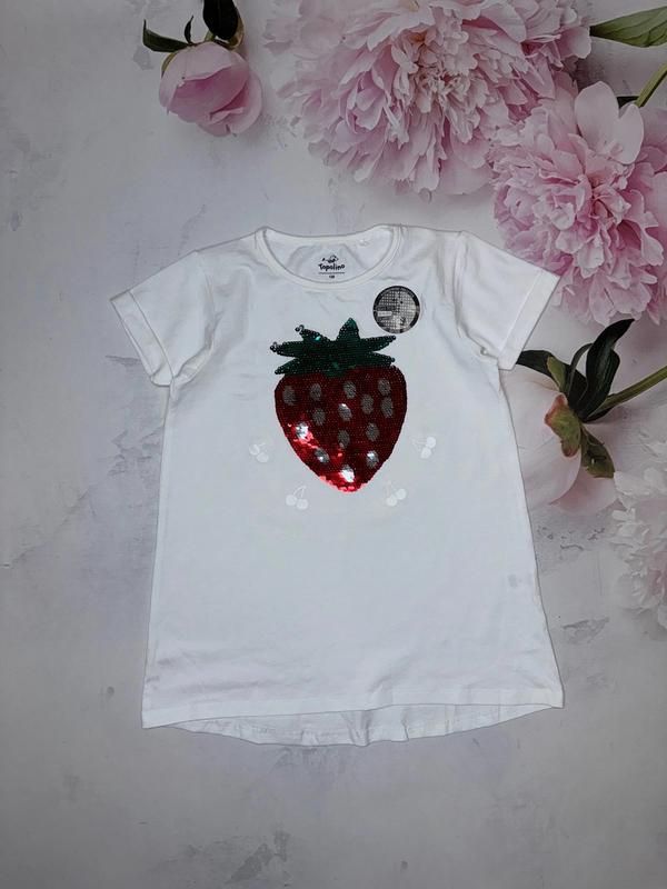 Футболка с клубничкой Пайетки интерактивные 🏷️Topolino 8 лет/128 Длина 50/53. ПОГ 34