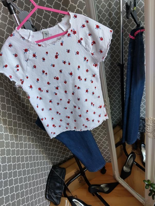 стан нової стильний топ приталений силует натуральний склад білосніжна в квітковий принт довжина 48 ширина під проймами рукавів у вільному стані 33 ( тягнеться +10)
