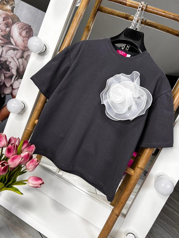 Нереально стильная футболка для наших модниц, Украшена очень красивым цветком Ткань турецкий кулир премиум качества, Украшение снимается, Качество очень красивое! Рекомендуем! Длина/пог 152-61/50 158-63/51