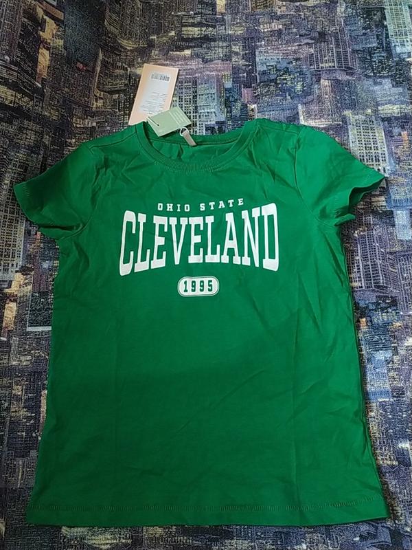 Футболка на девочку зеленого цвета, с принтом. Неаккуратные швы снизу, в цену учтены. Указан размер 122/128 Состав 95 хлопок, 5 вискоза Замеры длина 47, нот 36