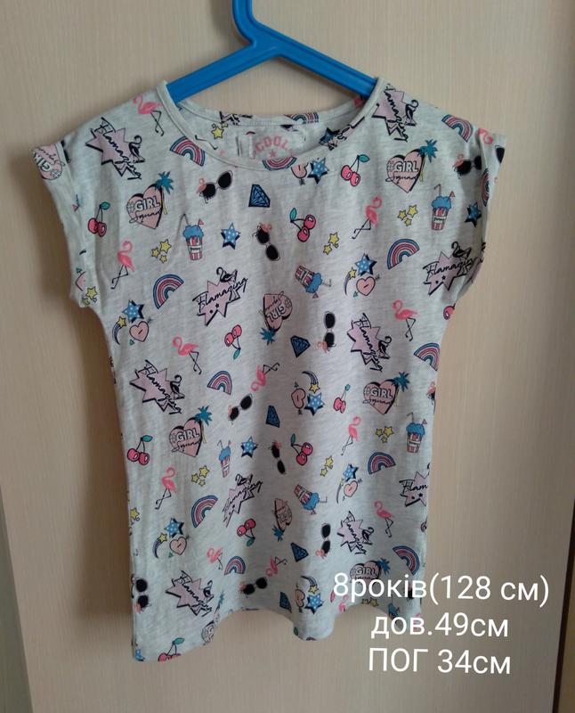 Футболка на дівчинку з оригінальним принтом в ідеалі. М'якенька,приємна. Заміри на фото.