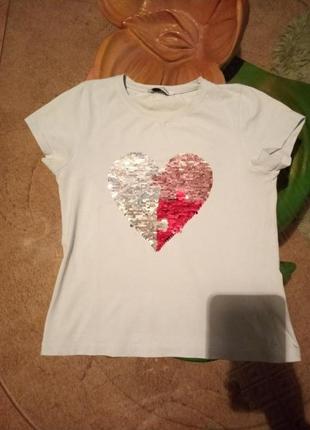 Футболка, паєтки - перевертні. Довжина від плеча 42 см, ПОГ 33 див. Є один маленький недолік 4-е фото додається, а так в цілому ідеальна.