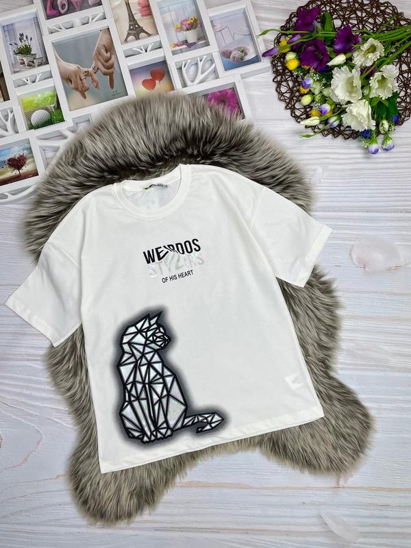 Стильные футболки оверсайз для красавиц 💗 качественный накат, красиво переливается тканина бавовна Производитель Турция ЦВЕТ МОЛОЧНЫЙ Замеры: длина/пог 128 р. - 57/47 С.