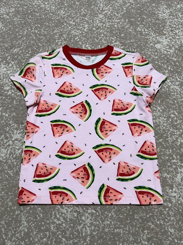 Футболка для девочки. Ткань стрейч кулир. Хорошего качества. Удобная и приятная к телу. Цвет розовый в арбузах. Размер- 116.