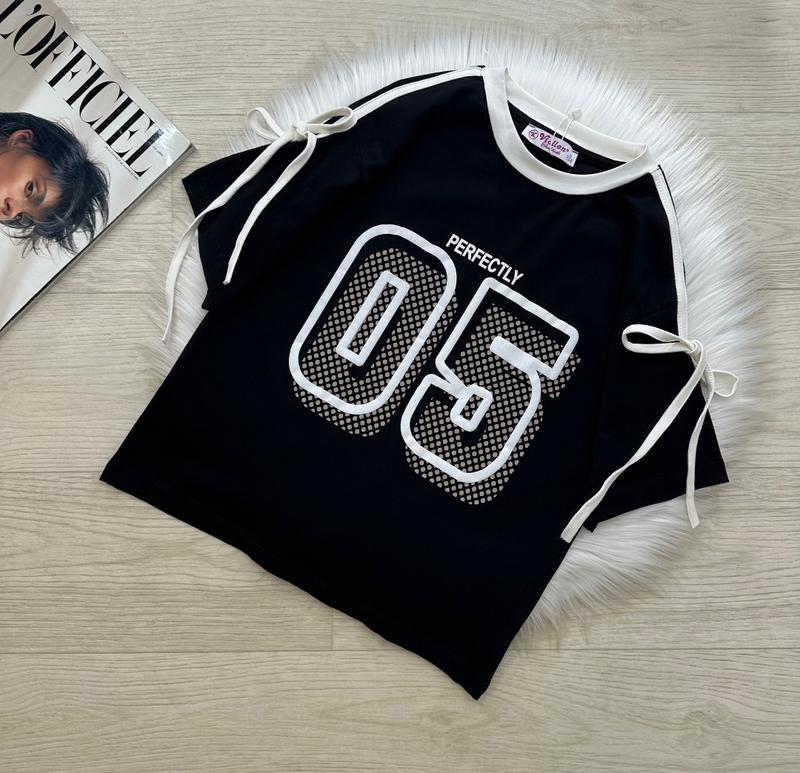 через кнопку купить только полная оплата! Стильная футболочка под любой образ 🤩🤩🤩 Трендовые лампасы с бантиками 😎 Свободный крой 🤩 Приспущене плече😉 Качественная легкая ткань 🔝😎 Тканина: трикотаж ( 94% котон/ 6% еластан) 🔝 Производитель: Турция 🇹🇷 р.8 лет (128см)-1шт ЗАМІРИ ⤵ +/- 1-2см!!! р.8 лет- длина от плеча 50см/ рукав от горловины 30см/ ПОГ 40см